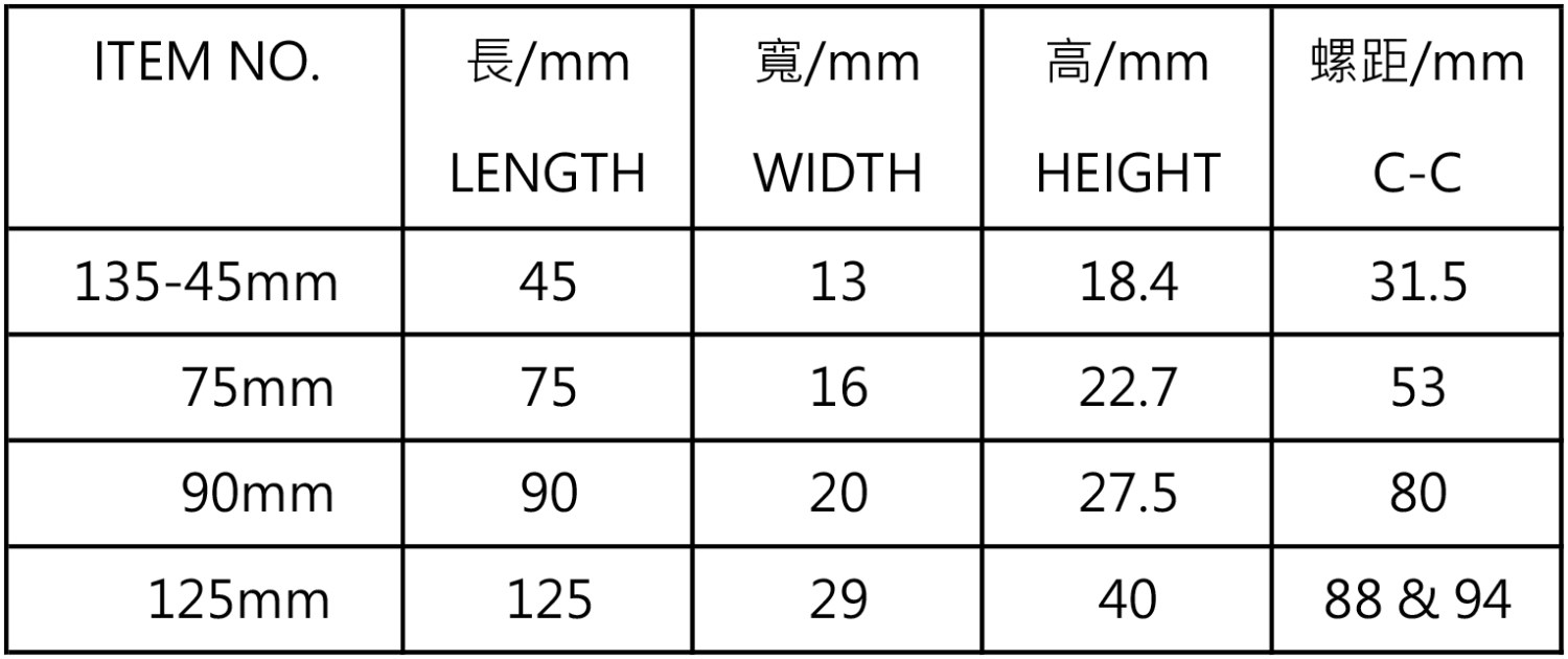 螺距:31.5 (45) / 53 (75) / 80 (90) / 88 & 94 (125) 單位mm