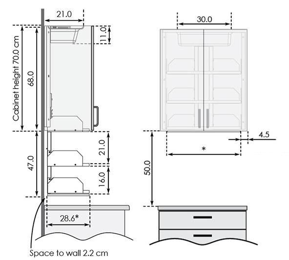 安裝簡單且只需很小的空間。櫃內高度空間適用為70-110公分,深度介於40-100公分以內。