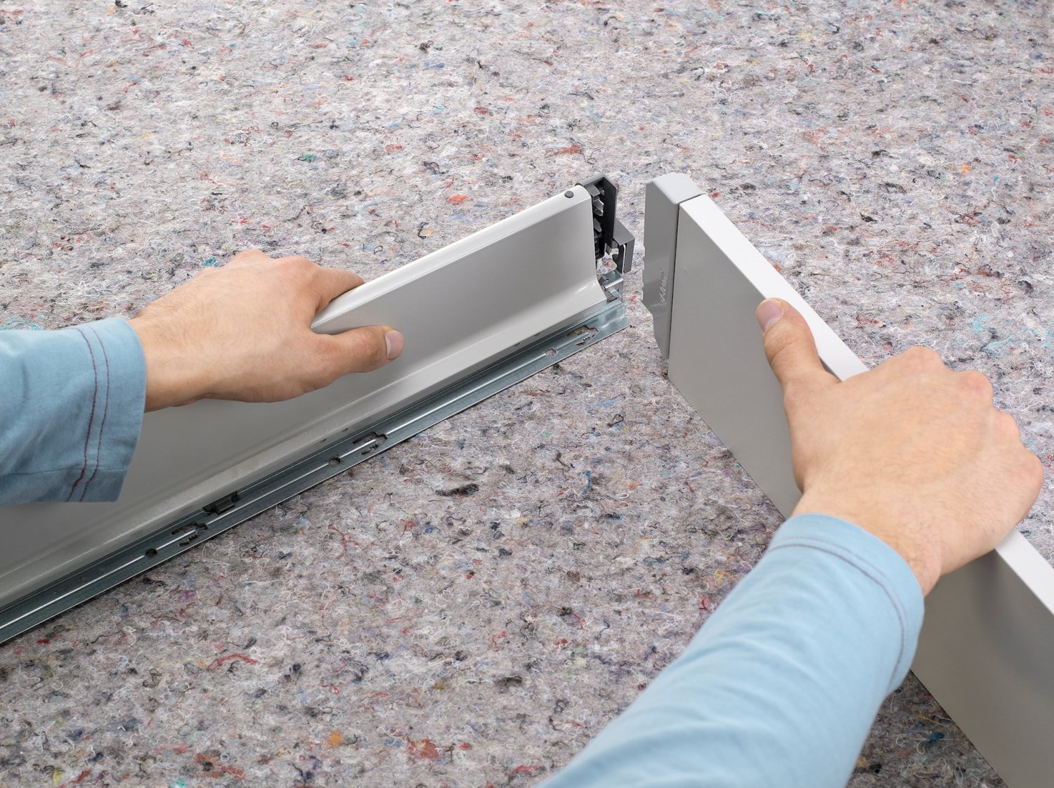 blum 的 TANDEMBOX 豪華金屬鋁灰抽滑軌,經過數百萬次的實踐證明,平穩順暢滑行的性能讓廣大客戶為之驚豔。BLUMOTION 緩衝阻尼則打造出輕柔關閉效果。完善的產品線(低抽、中抽、高高抽)和多功能內裝分隔配件,讓您能在面對客戶多樣化需求時,輕鬆找到合適的解決方案以及應用設計。